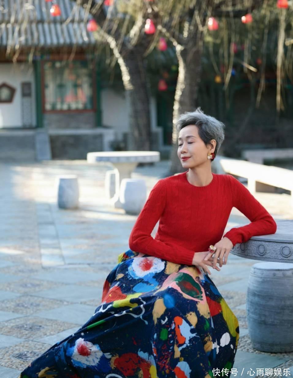 红色针织衫不仅颜色饱满还很亮,由于是紧身款,所以将女性的身形分分钟勾勒出来。腿上的半身裙仿佛是一件艺术品,彩色印花分布在整个裙子上,艺术气息很浓厚。坐下时大裙摆自然散开,让人瞬间想起来“油画”这个词。