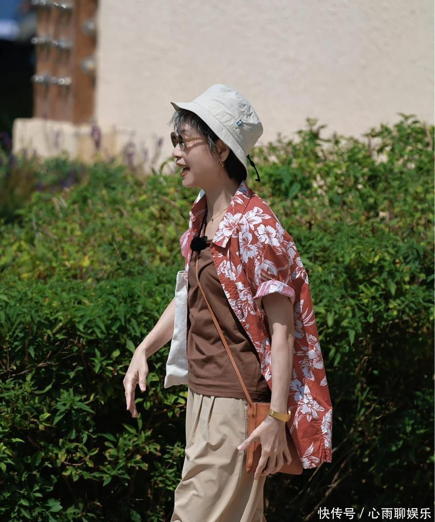 这件短袖不仅融入了开衫设计,还能看到小翻领。白色花纹的出现,让短袖层次感增强不少。内搭有可能是吊带,其是深棕色面料,没有其他颜色的加入,看着简约又大气。下身阔腿裤为浅卡其色,面料垂坠感不是一般的强,宽松裤型的好处之一,就是穿腿上后肌肤没有什么束缚感。棕色小包的出现让层次感增强,也能容纳一些东西。这一身穿搭的配色温暖又和谐,从穿着者身上可以看到四个字--随性自在。