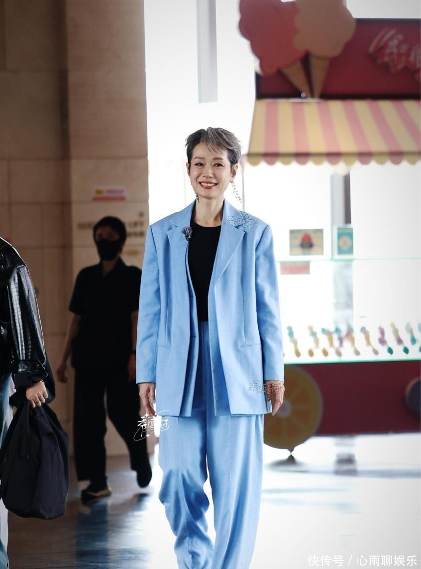 浅蓝色西服套装给人的感觉是清爽极了。宽松的西装外套面料垂坠感很强,版型利落又随性,不具有传统西装的那种紧绷感,穿上它走路时则自带松弛气场。黑色打底和浅蓝色面料的碰撞瞬间擦出了时尚的火花。蓝色阔腿裤藏肉效果绝佳,也能悄悄帮你拉长腿部线条。