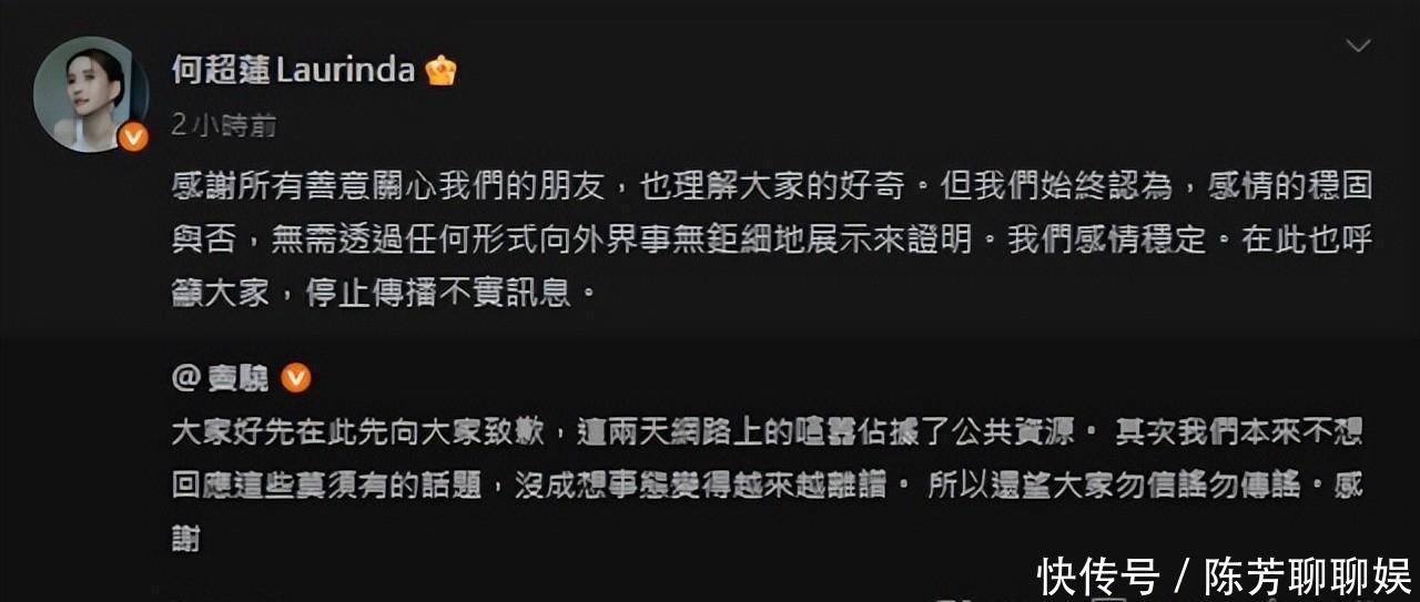紧接着何超莲也转发了丈夫的声明以冷静且优雅的文字回应风波。她感谢大众的关心也理解外界的好奇心但强调感情的稳固与否不需要通过晒恩爱或解释细节来证明。她语气坚定表示“我们感情稳定。”最后她也呼吁外界停止传播不实信息希望这场毫无根据的舆论风暴能就此结束。从相恋到成婚一直是焦点情侣回顾两人的爱情历程何超莲与窦骁自2019年公开恋情以来一直是话题焦点。两人不仅颜值登对背景反差也极具看点一位是赌王千金、一位是实力派演员。2023年两人在巴厘岛举行浪漫婚礼星光熠熠、盛况空前。婚后二人虽各自忙碌但多次被拍到同框出行甜蜜互动不断。